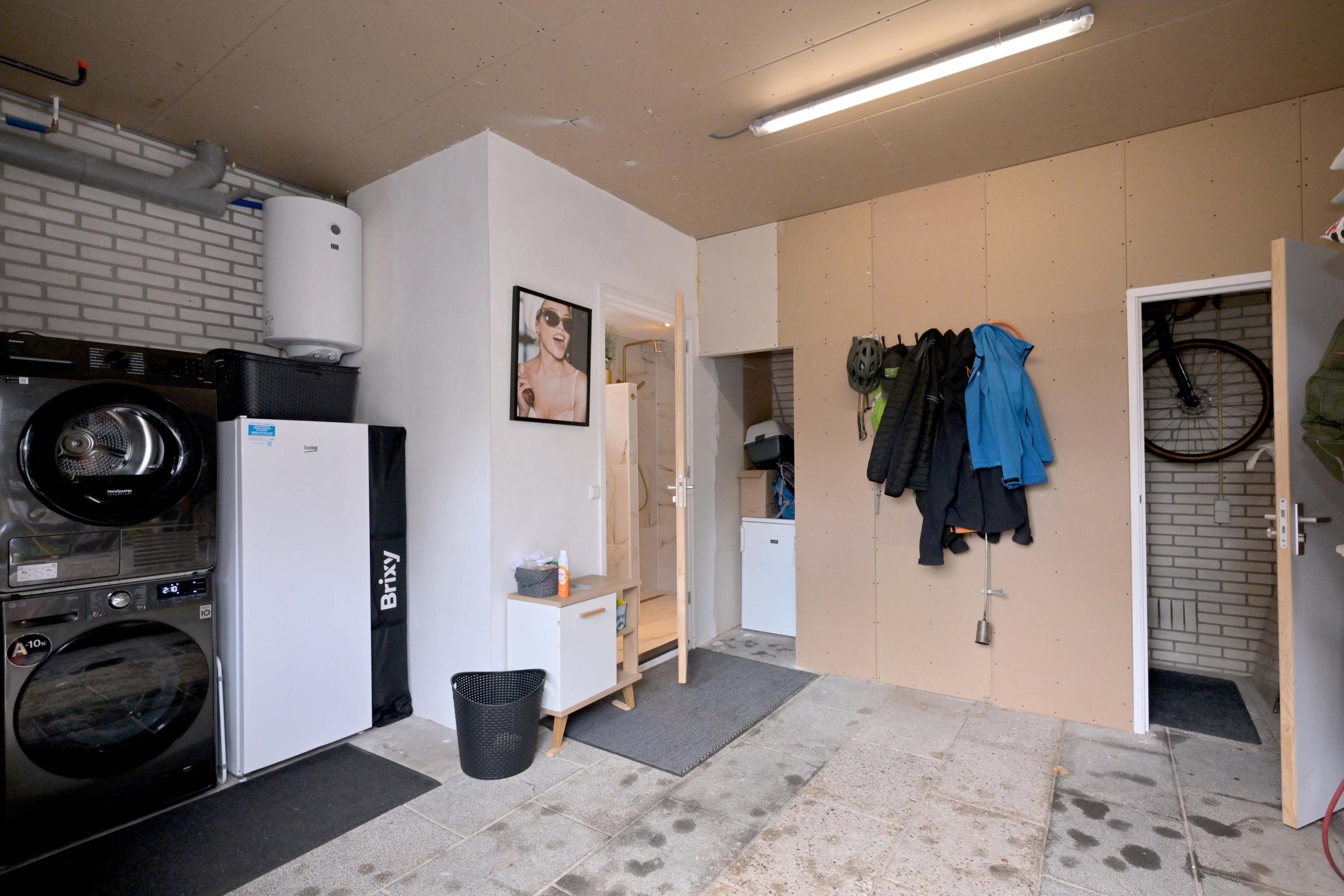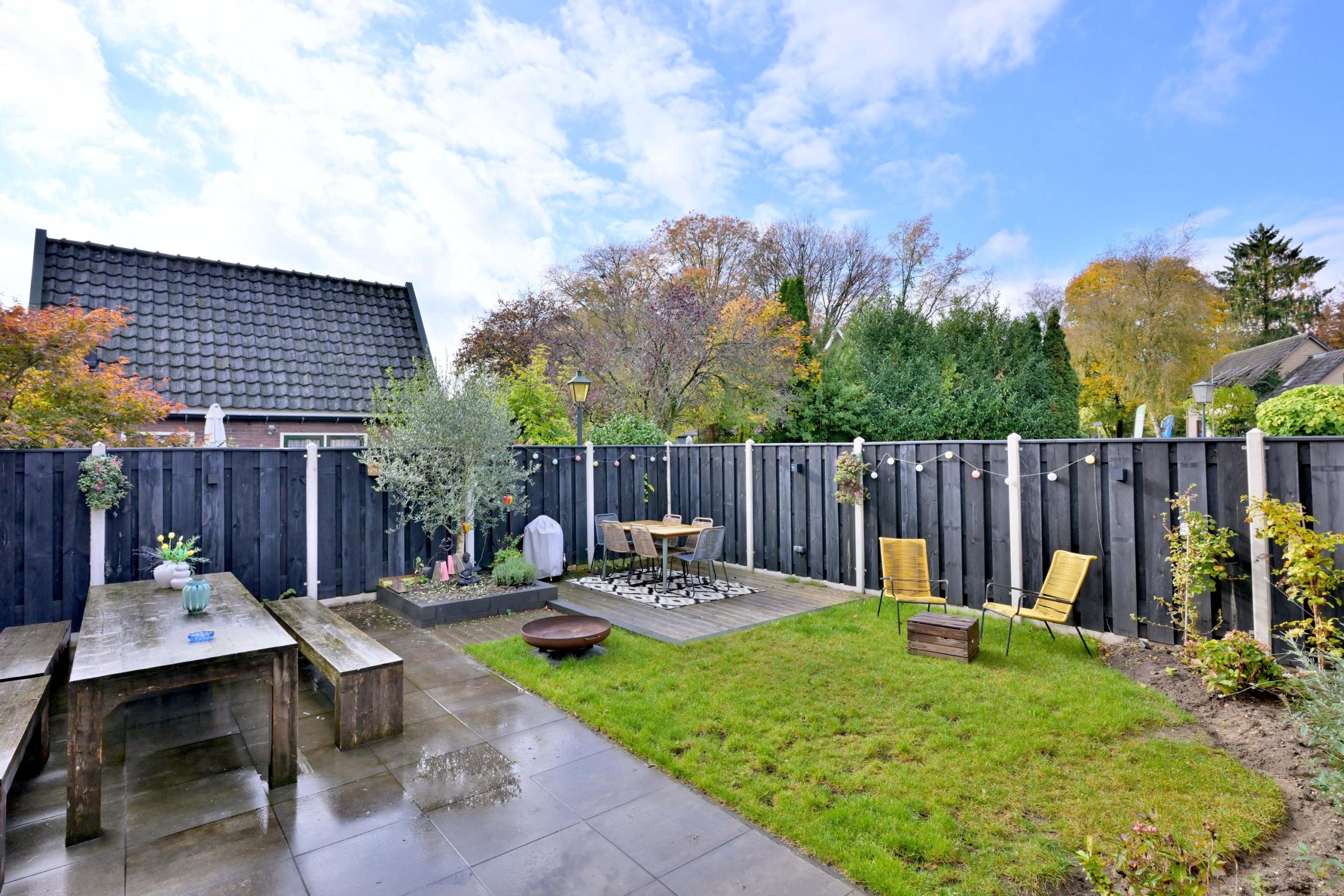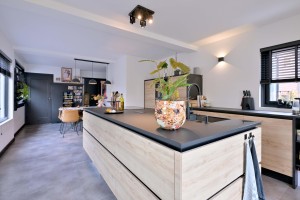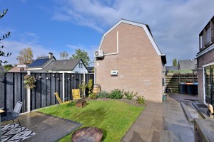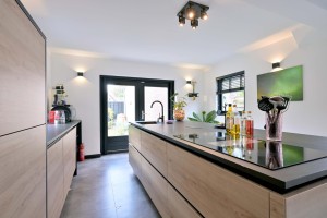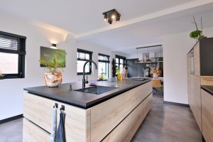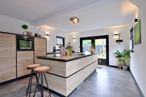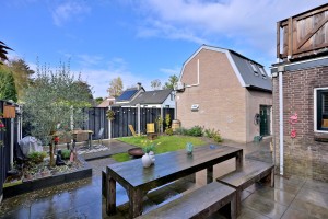 Loop door naar de achterzijde van de woning naar de woonkeuken, de eyecatcher van de woning. De keuken is voorzien van moderne apparatuur en een kookeiland. Het zonnige terras en de achtertuin zijn bereikbaar door de openslaande deuren.