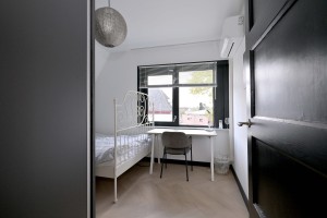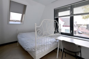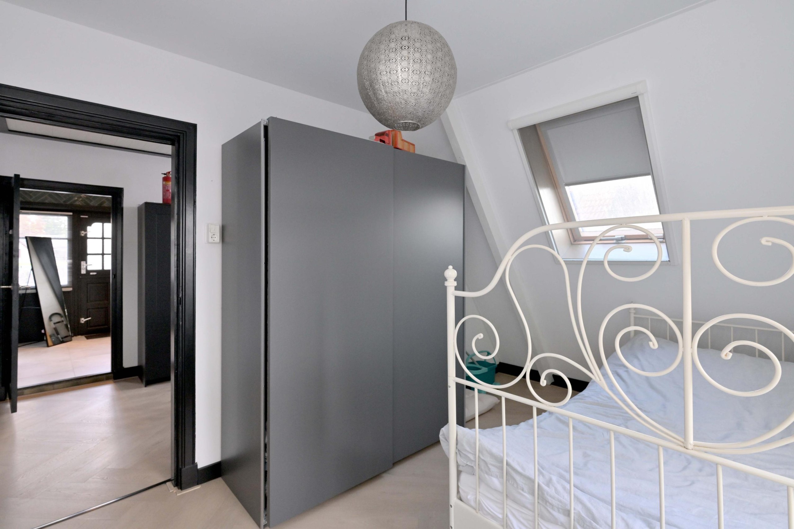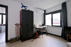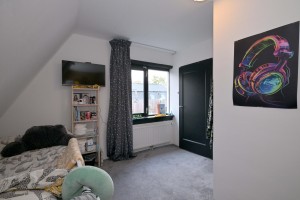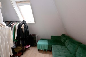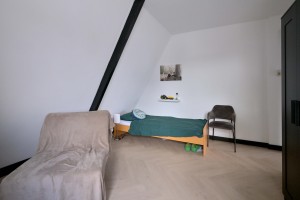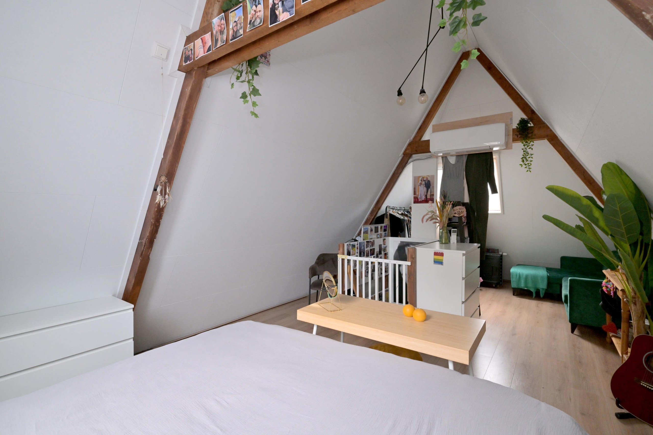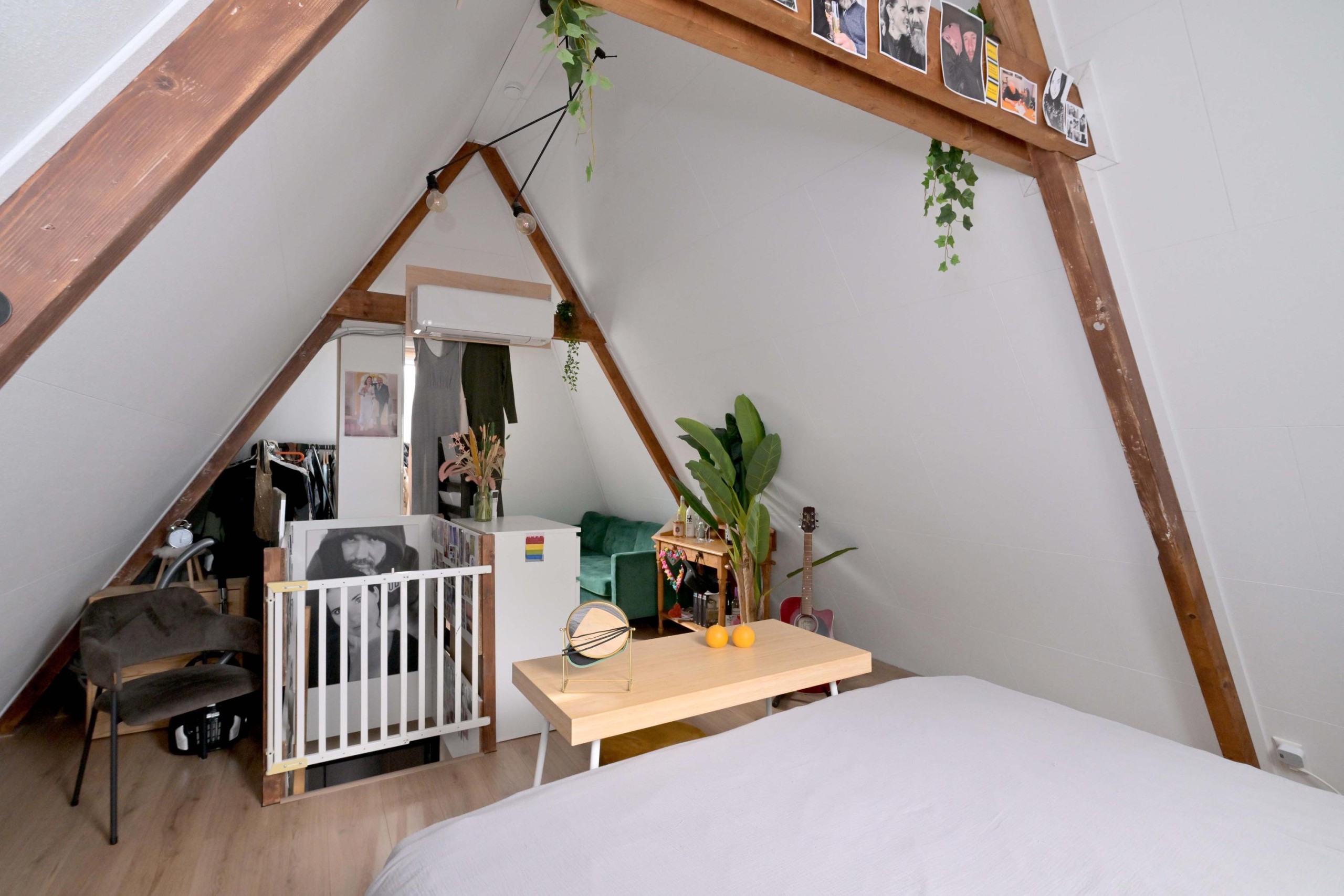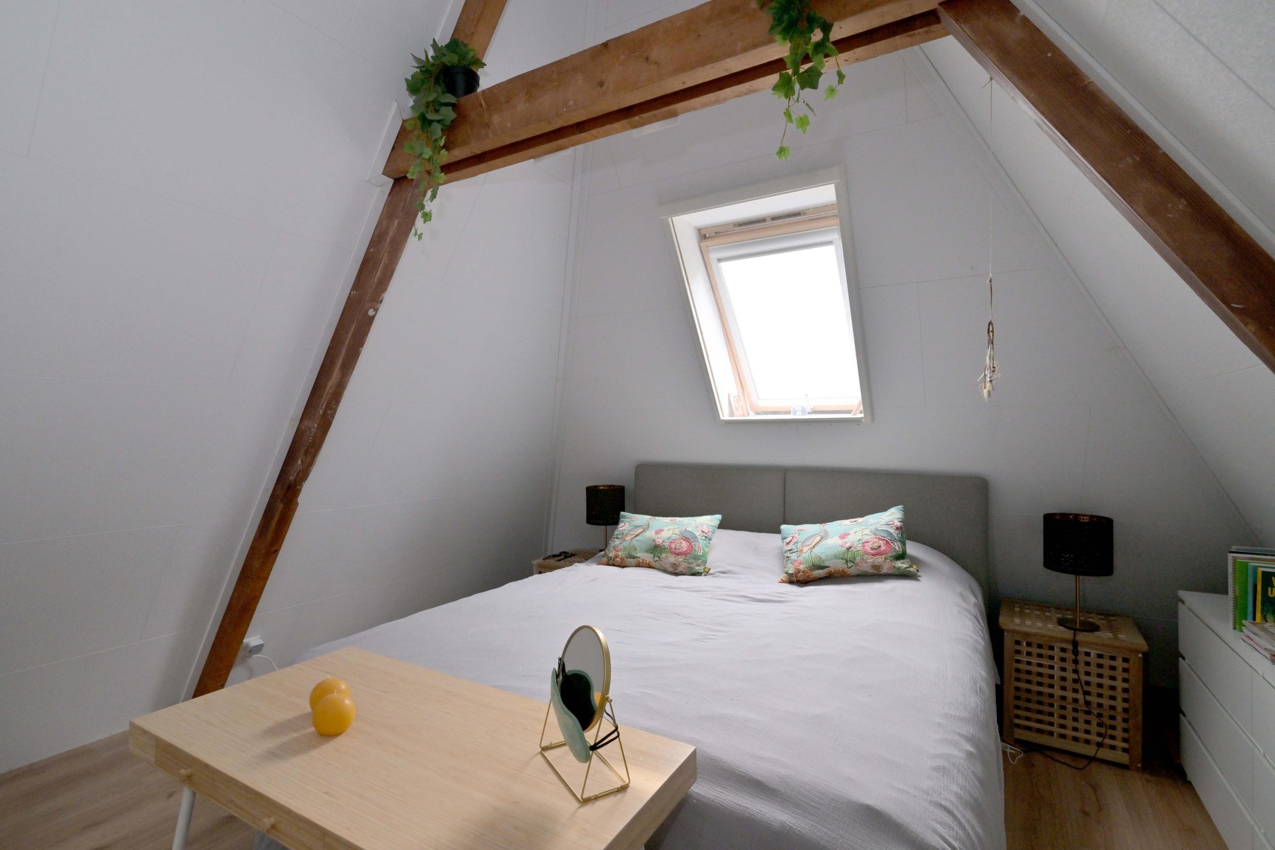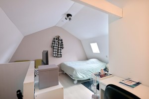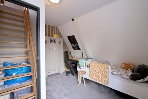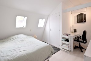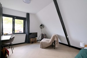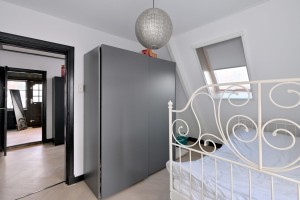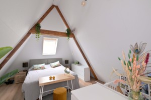 Onder de schuine kanten van het dak met zijn originele dakspanten bevindt zich de vierde slaapkamer.