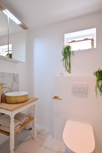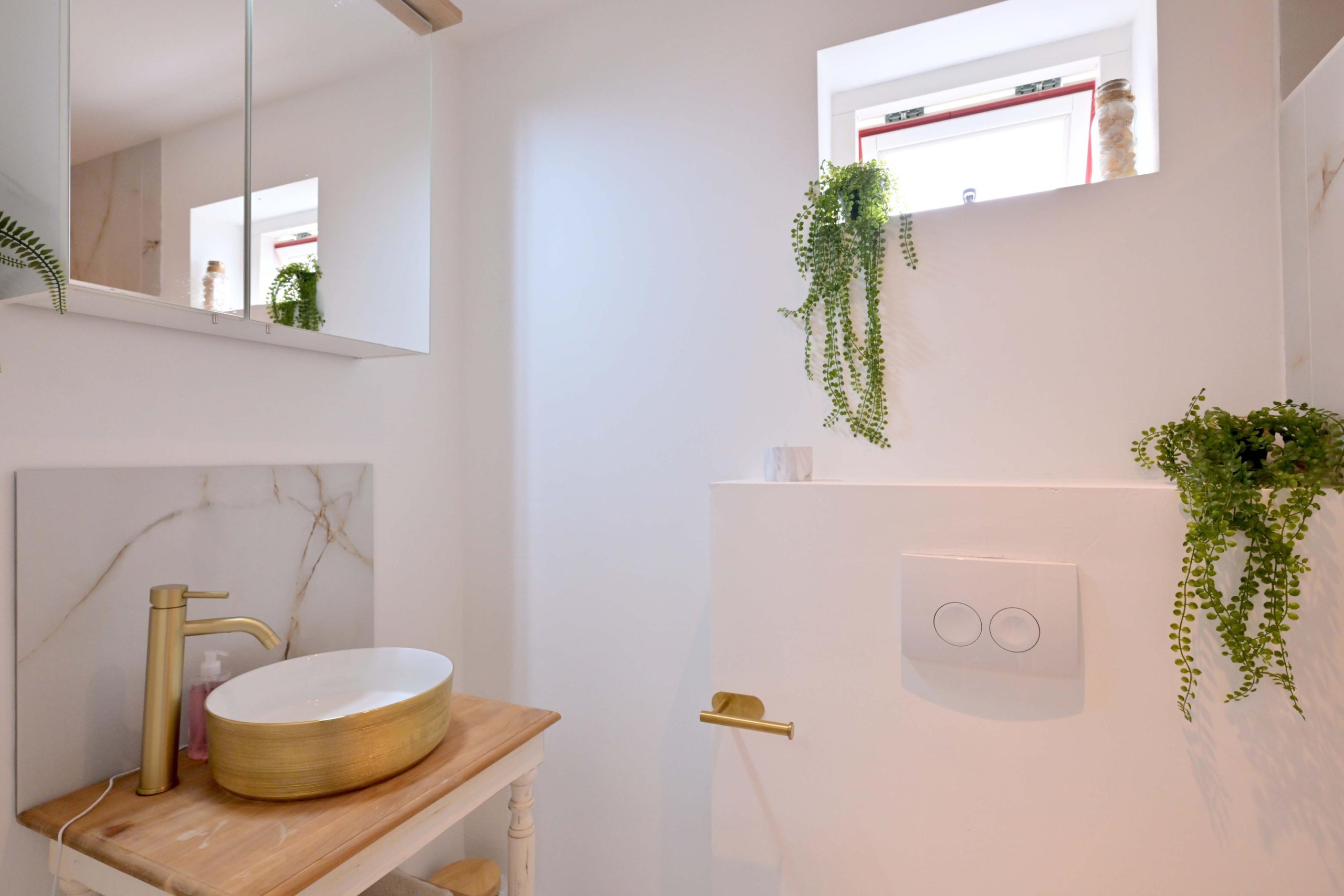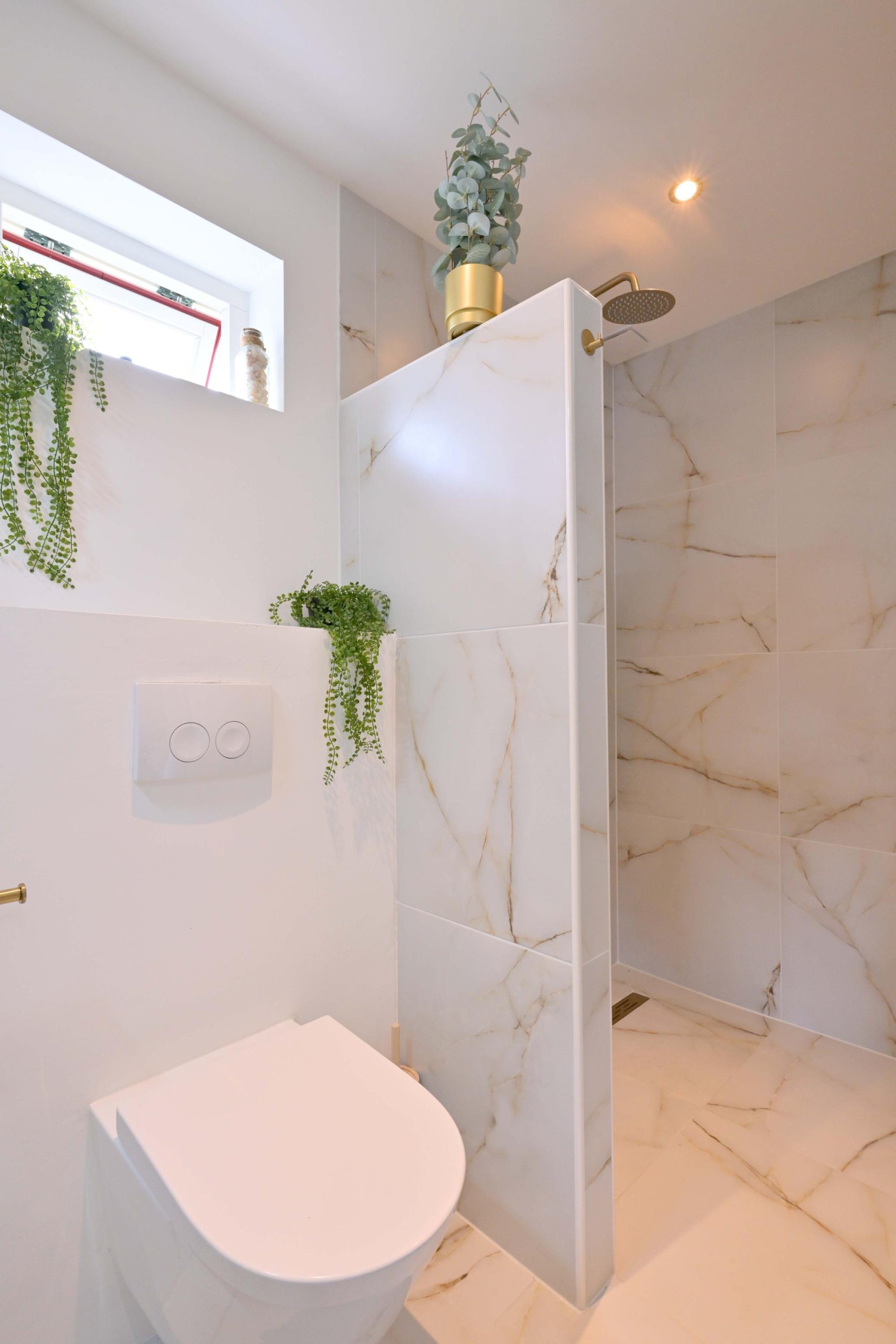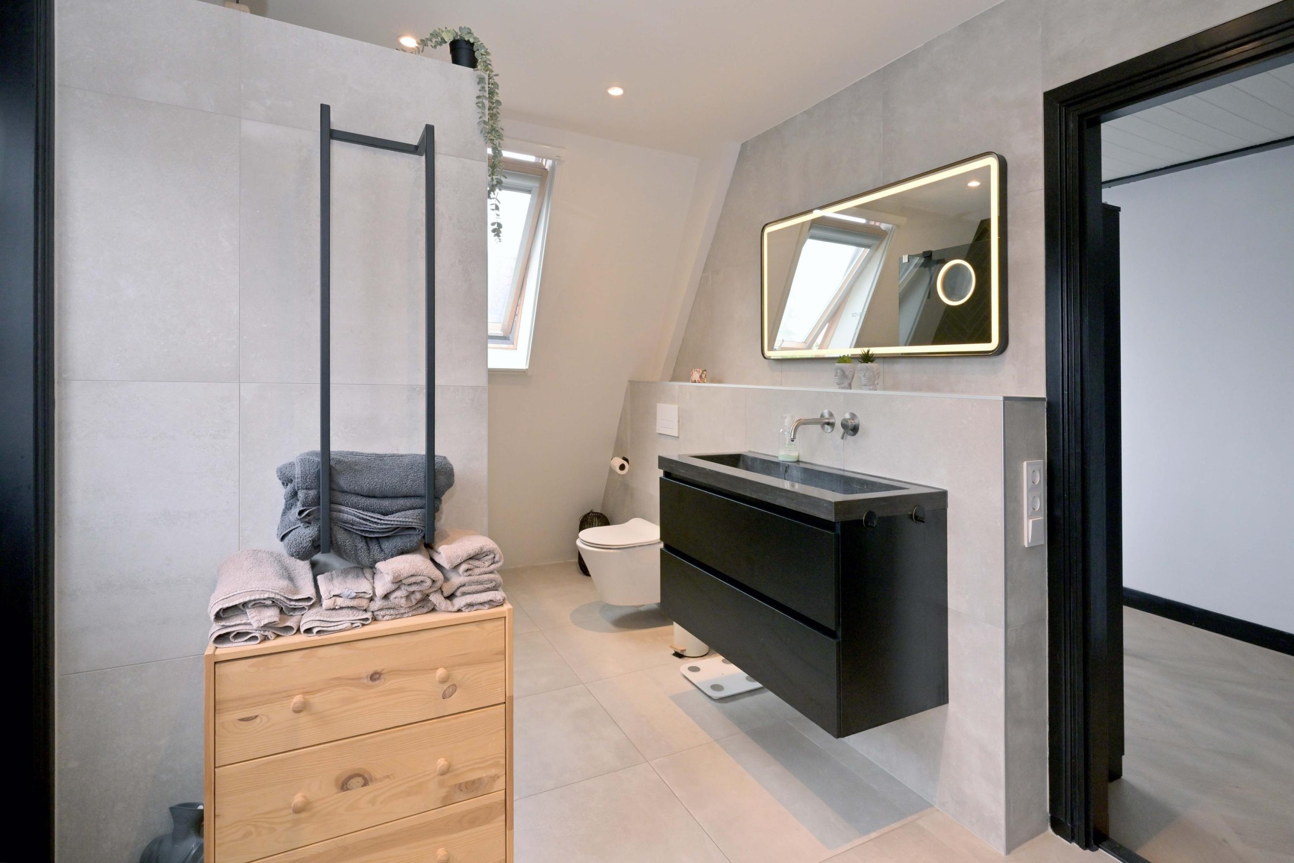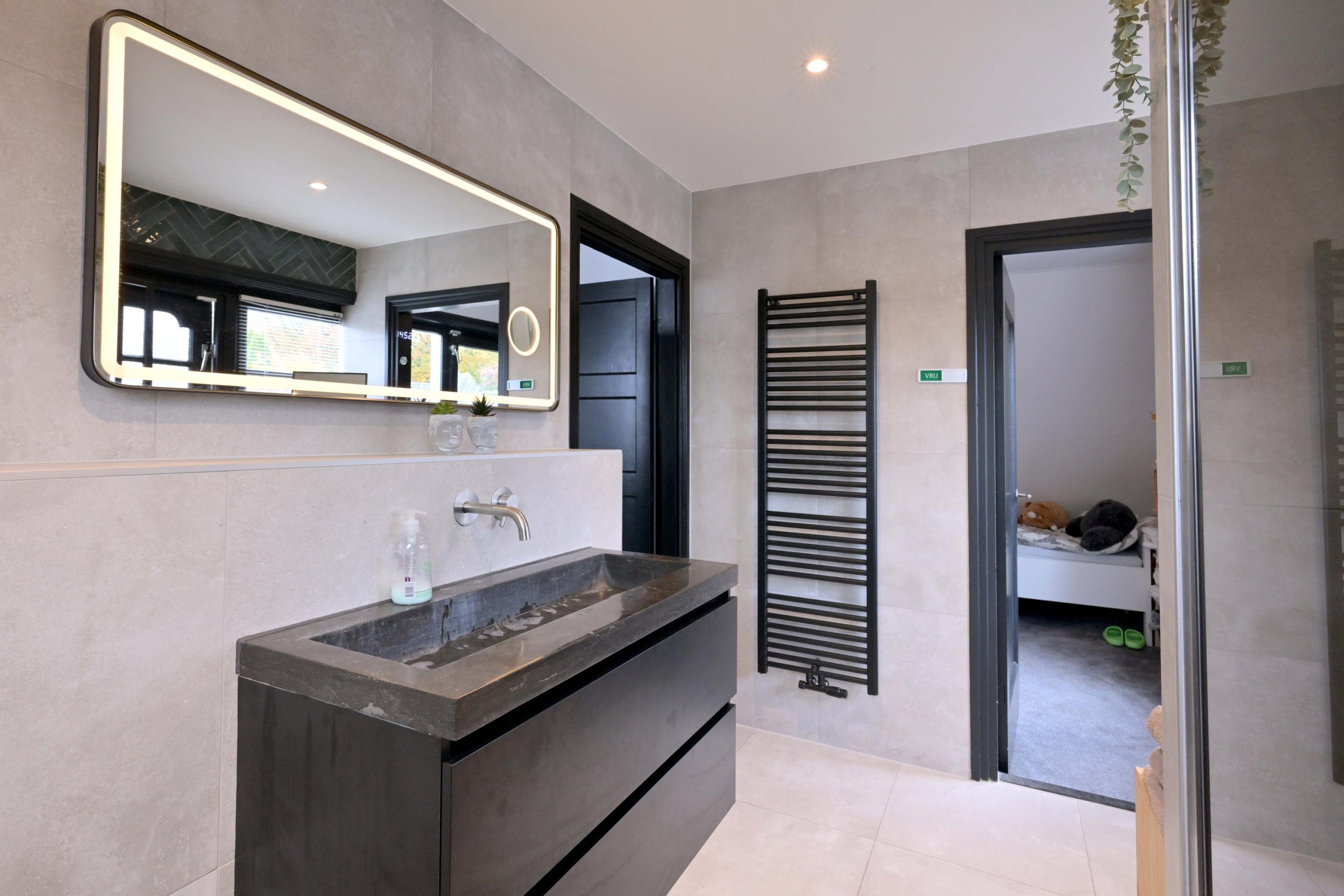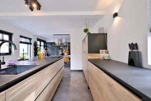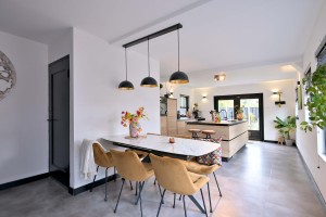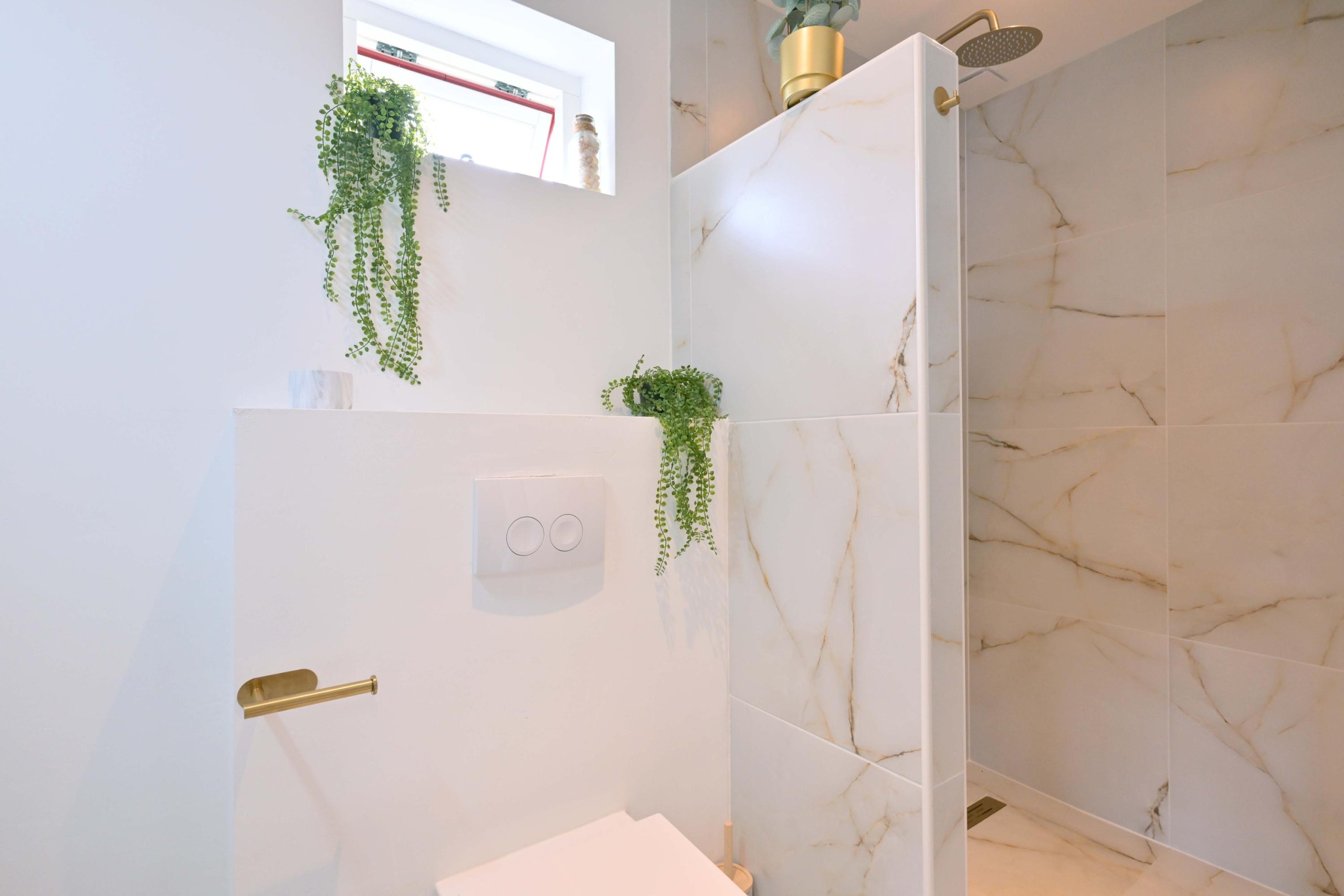 De L-vormige living (ca. 60 m²) is riant en licht, met prachtige moderne gebronsde ensuite met softclose taatsdeuren die een subtiele scheiding creëren tussen de verschillende leefruimtes.