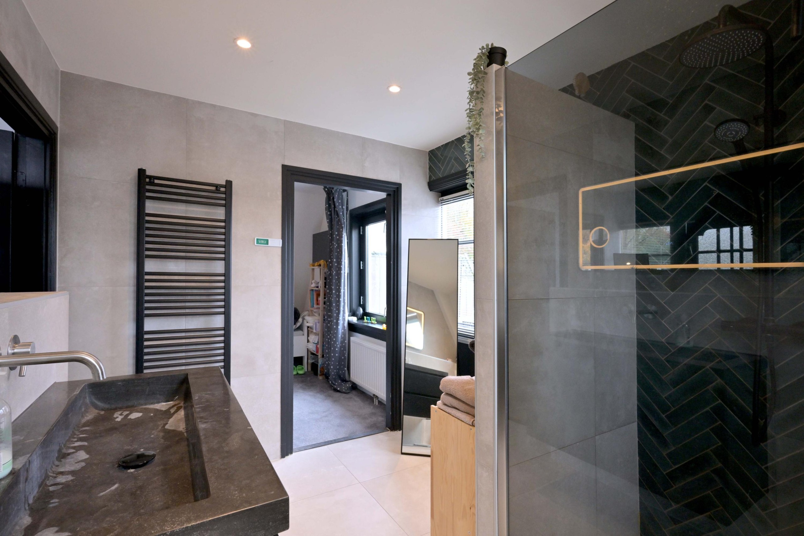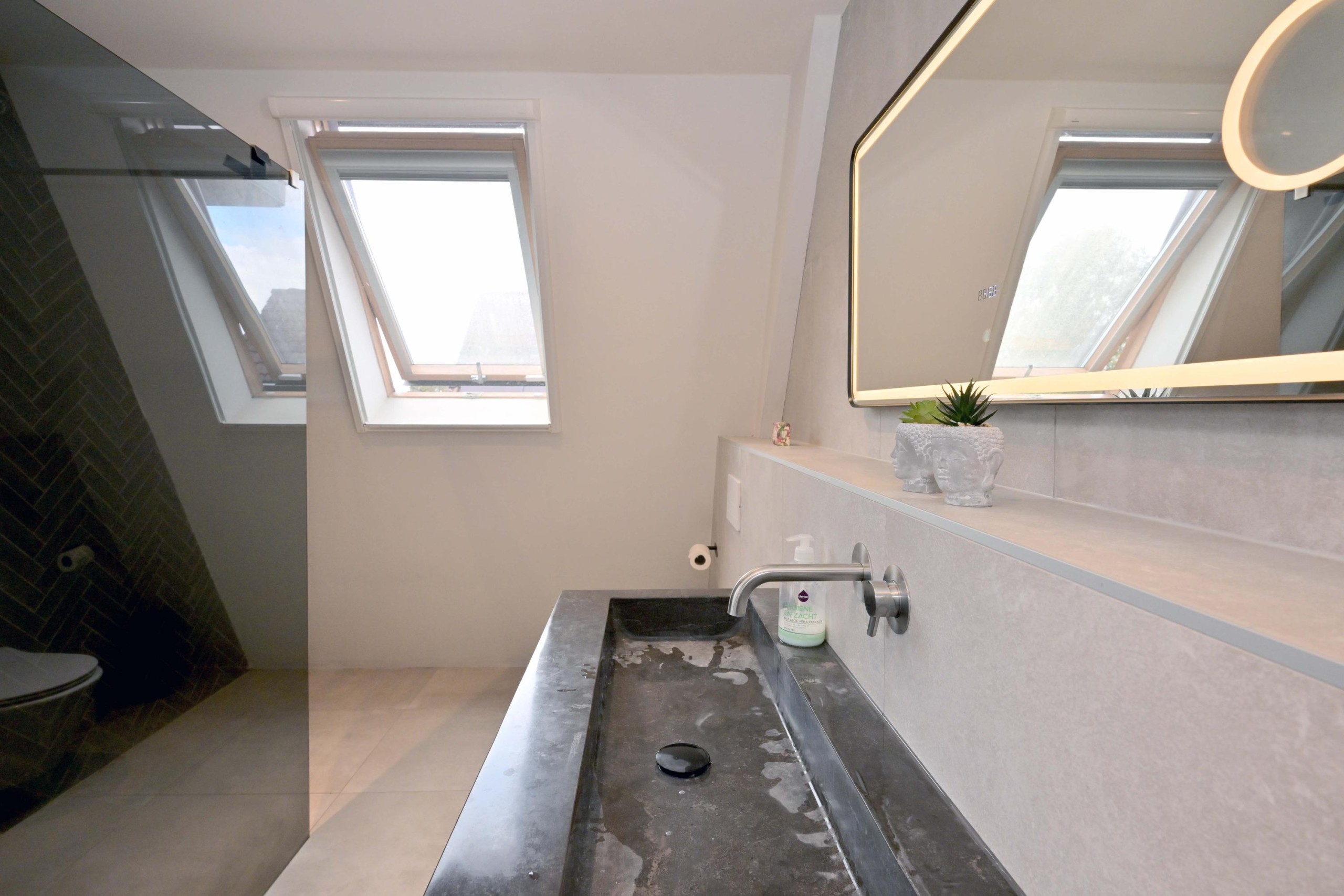 Via de brodestrap met een prachtig glas in lood raam bereik je de verdieping. Hier bevinden zicht drie ruime slaapkamers en een moderne eigentijdse badkamer voorzien van een royale inloopdouche, badkamermeubel met een hardsteen afwerking en een 2e toilet.
