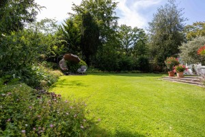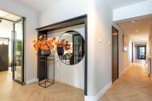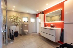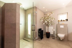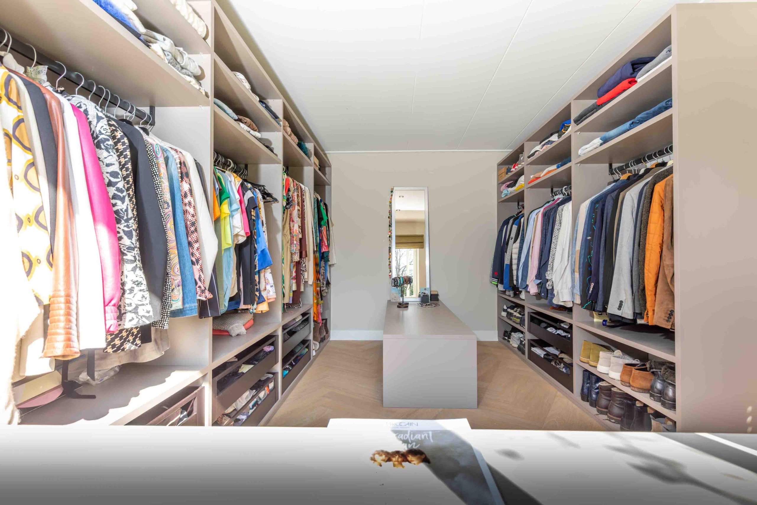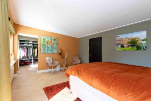 Via de hal naar de achterzijde van de woning zijn twee slaapkamers gelegen. Eén met toegang tot een zeer royale walk in closset en tot de moderne badkamer welke is voorzien van een luxe inloop douche met sunshower, toilet, modern dubbel wastafelmeubel.
