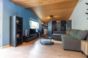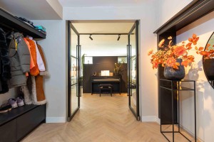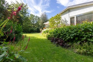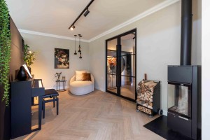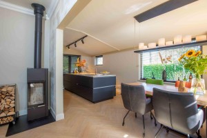 Entree, hal met een ruime garderobe. Loop via de taatsdeuren naar de ruime woonkamer met houtkachel. Vanuit de woonkamer is er toegang tot de tuin en veranda aan de achterzijde.