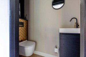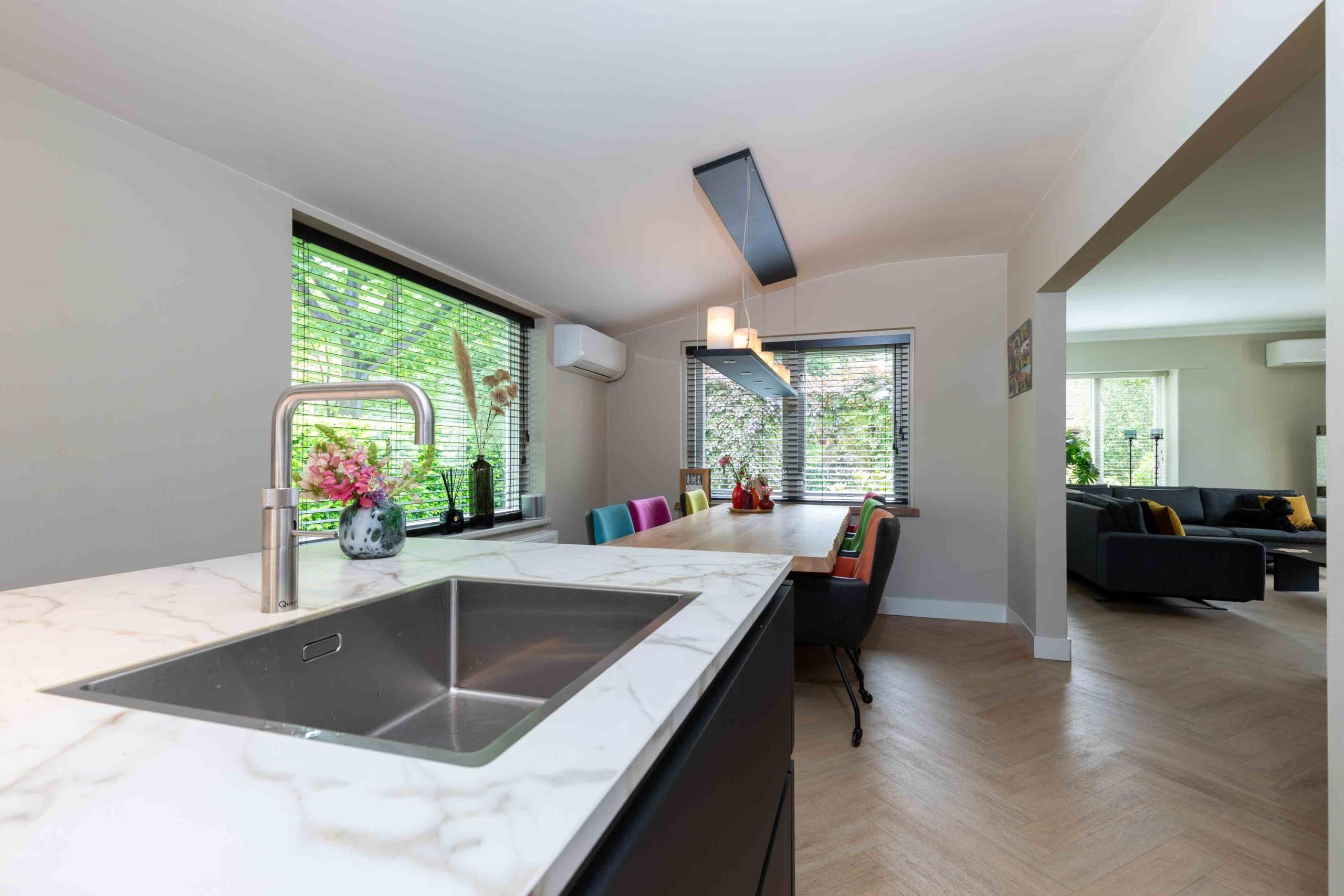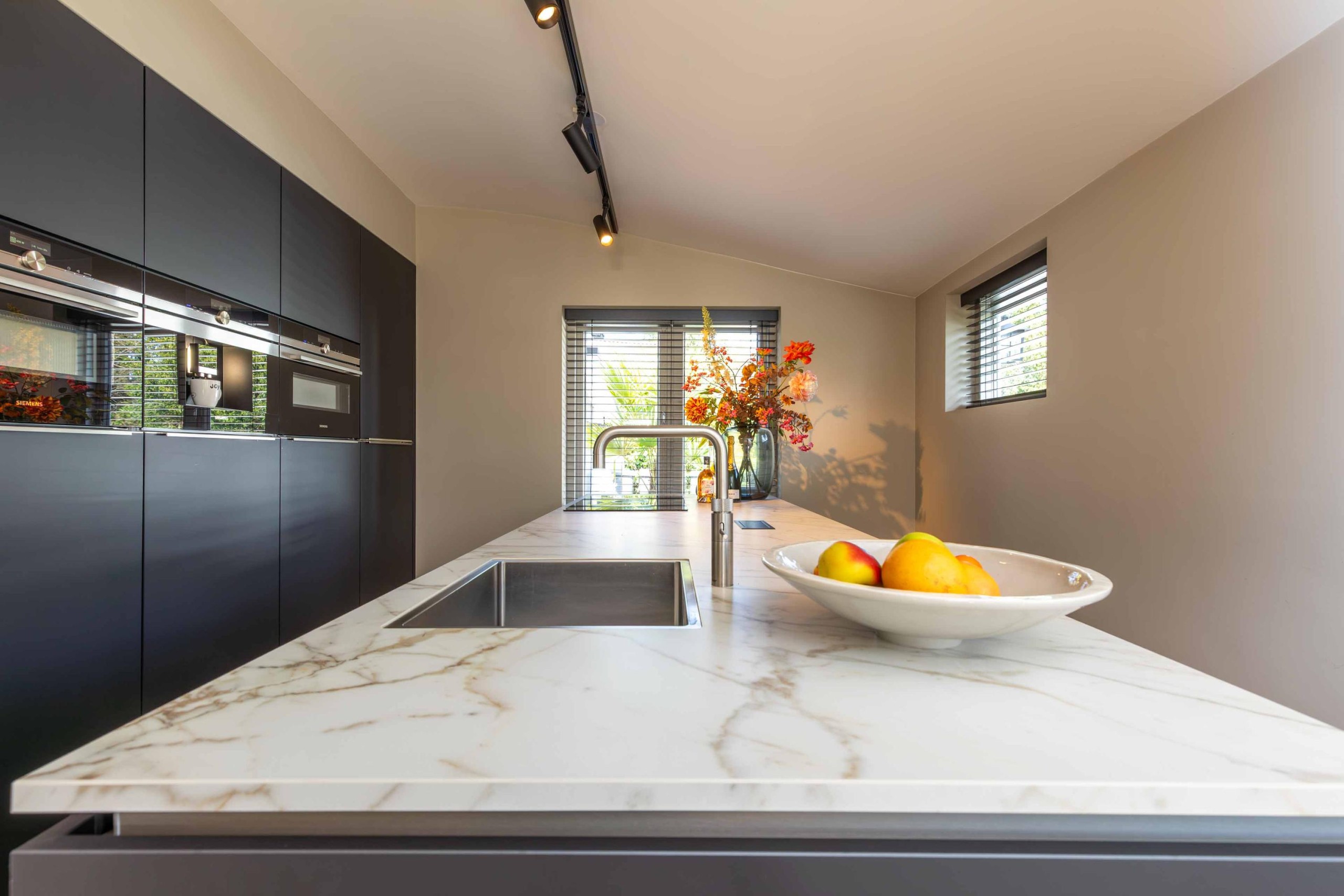 Aan de voorzijde van de woning is de open woonkeuken gelegen. De keuken is eenstrakke design keuken, op maat gemaakt en voorzien van luxe inbouwapparatuur.