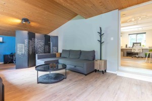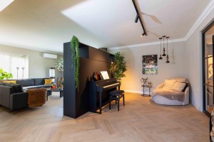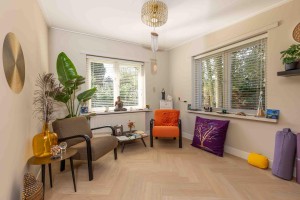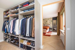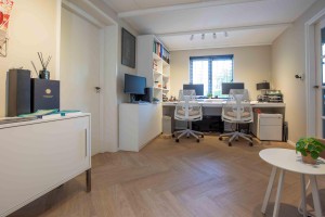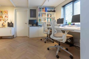 Aan de voorzijde van de woning is een werkkamer/studeerkamer. Aansluitend is de derde slaapkamer aan de achterzijde bereikbaar. Via deze slaapkamer is er een eigen terras bereikbaar.