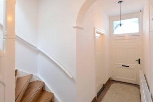 entree, hal met originele granitovloer en trap naar de eerste verdieping.