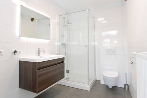 Aan de achterzijde bevindt zich een ruime slaapkamer, een moderne badkamer welke is voorzien van een douche, toilet en wastafelmeubel en een berging met aansluiting voor een wasmachine.